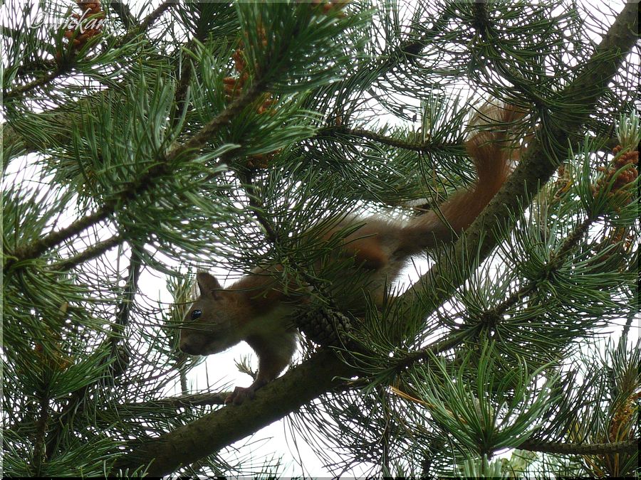 Nie miałam do tej pory szczęścia by spotkać i fotografować wiewiórki. W naszym parku ich nie widać, w lesie też nie spotkałam.Wczoraj w ogrodzie usłyszałam hałas na sośnie, myślałam, że to jakiś ptak łupie szyszki a to była wiewiórka :) Przeskakiwała z gałęzi na gałąź, wybierała szyszki, pozwalała się fotografować, ale miałam radości :) Myślałam, że może dzisiaj też się pojawi ale nie pokazała się. Może jeszcze mnie odwiedzi, jest prześliczna :)